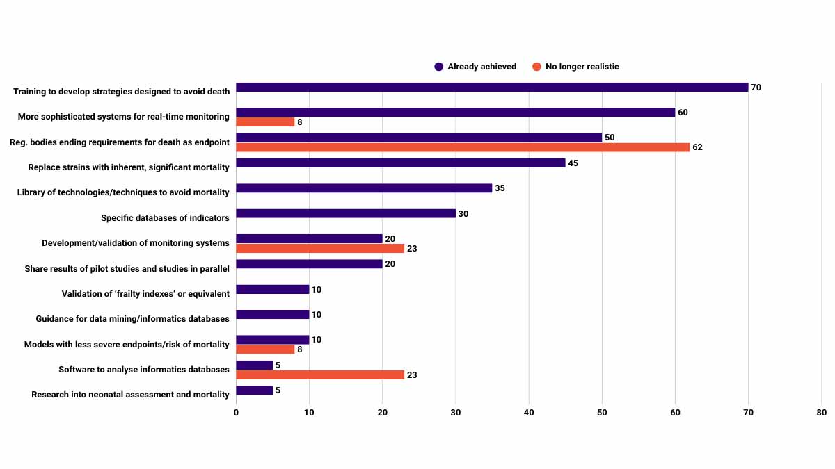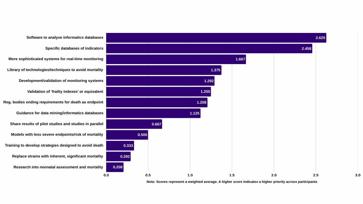 In this session led by Penny Hawkins from the RSPCA’s Animals in Science Department, participants were asked to reflect on the ‘Wish list’ included in the ‘Avoiding mortality in research and testing’ report. This wish list details key developments, identified by contributors to the report, that would further assist in avoiding mortality (Appendix A).