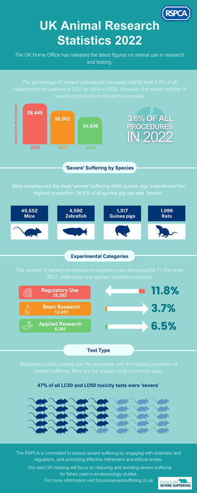 There has been a significant decline in the number of laboratory animals experiencing ‘severe’ suffering in the UK. Since 2014, there has been a remarkable 61% reduction in experimental procedures causing ‘severe’ suffering. The 2022 statistics continue to demonstrate this trend, although between 2021 and 2022 there was a slight increase in the proportion of severe procedures, from 3.4% to 3.6%.