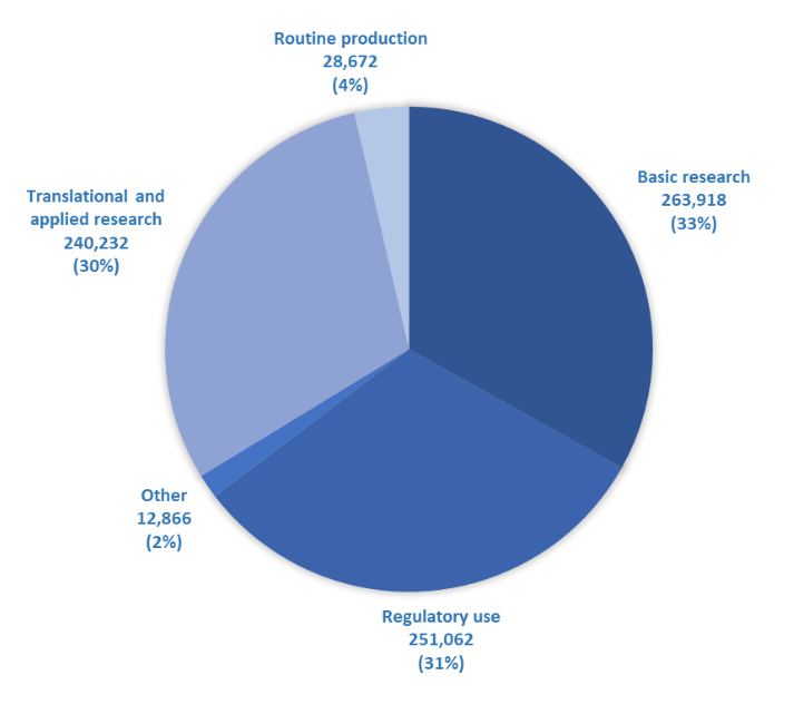 The use of the mouse ascites method for the production of monoclonal antibodies continues to be of concern. Alternative approaches are available and this method has not been used in the UK, for example, since 2012. Although use of this method decreased by 35% between 2018 and 2019, 2020’s figures saw it increase by 12%. This increase, and its use generally, was almost entirely reported by one member state – France. Improved application of refinement techniques and earlier endpoints are probably responsible for the reduction in the associated severity reported – 34% now being reported as severe, compared to over 90% in the past. The statistical report highlights that further efforts are apparently taking place to review ongoing projects involving the use of mouse ascites.