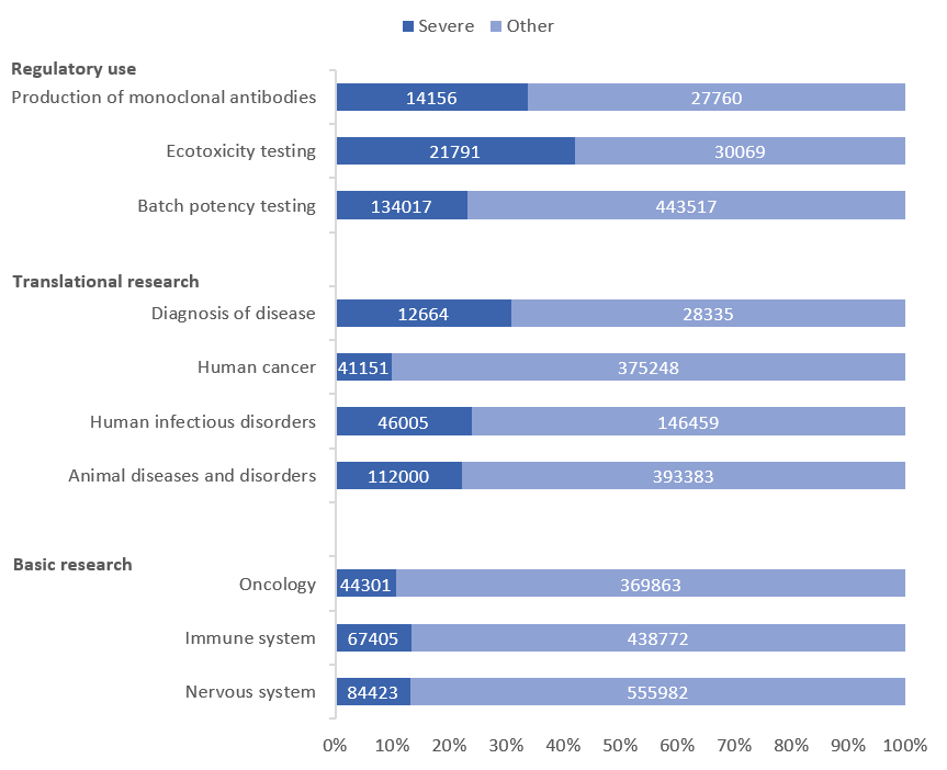 This information is very important for promoting transparency and openness. It also plays a vital role in directing efforts more effectively towards the 3Rs in animal research. This summary of the data outlines the number of animals reported to have experienced ‘severe’ suffering.