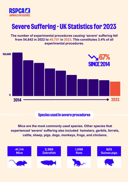 On 11 September, the 2023 statistics on animal research in the UK were released. We are encouraged by the continued decline in the number of animals experiencing ‘severe’ suffering. This represents significant progress since 2014 towards our goal of ending severe suffering in animal research.